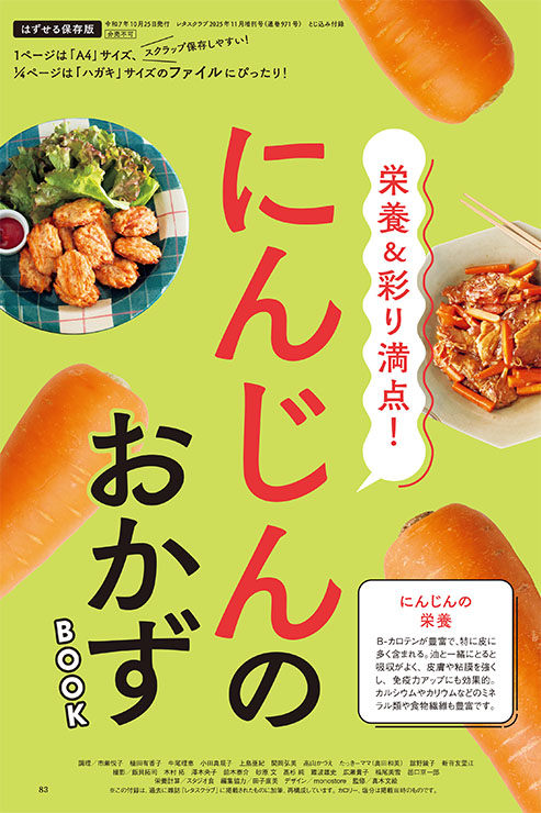 少しずつ気温も下がってきて、しみじみ煮ものが食べたくなる季節がやってきました。今号はそんな時期にピッタリな「短時間で味しみ煮もの」特集です!ちょっとしたテクを加えるだけで、じんわり味のしみた絶品煮物が完成します。料理企画では他にも、手軽にできる「春巻き」や、ひと皿で栄養満点な「炊き込みご飯」など、盛りだくさん。また、3号連続で皆さんの「ご自愛」を応援する特集がスタート!第1弾は「老け髪・白髪ケア」企画です。日頃のケアを見直して、美髪を手に入れましょう!その他、古堅純子さんによる「片づけビフォーアフター」や、化け子さんに教わる「ベースメイクのマル秘テク」など、今知りたい情報が満載。特別付録は毎年大好評の「SNOOPYカレンダー2026」。 献立の悩みから解放される!と話題の「月~金×4週分の晩ごはん 11月の平日ラク献立」と、とじ込み付録の「にんじんのおかずBOOK」もついて、付録も大充実です!オトナのNEWS連載は増田貴久さんが登場します。FOCUS ON K-STARSではドラマ「コンフィデンスマンKR」に出演のパク・ミニョンさん、パク・ヒスンさん、チュ・ジョンヒョクさんが登場!コミックエッセイも多数!レタスクラブ11月増刊号をぜひお楽しみください。
