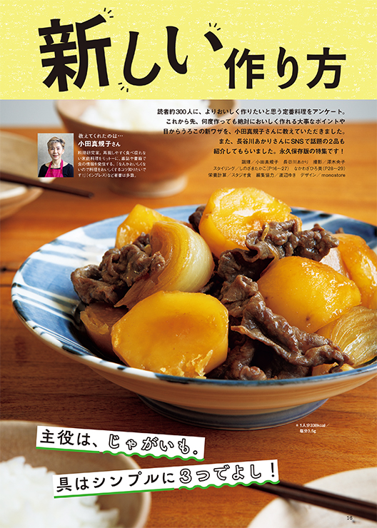 今号の料理特集は「定番おかずの新しい作り方」! 読者約300人に、おいしく作りたいと思う定番おかずについてアンケート。そこで人気が高かったものについて、何度作っても絶対においしく作れるポイントや、目からうろこの新ワザを小田真規子さんに教えていただきました。その他にも、旬の新じゃが&新玉ねぎレシピや、「お肉の切り方の正解」など盛りだくさん!