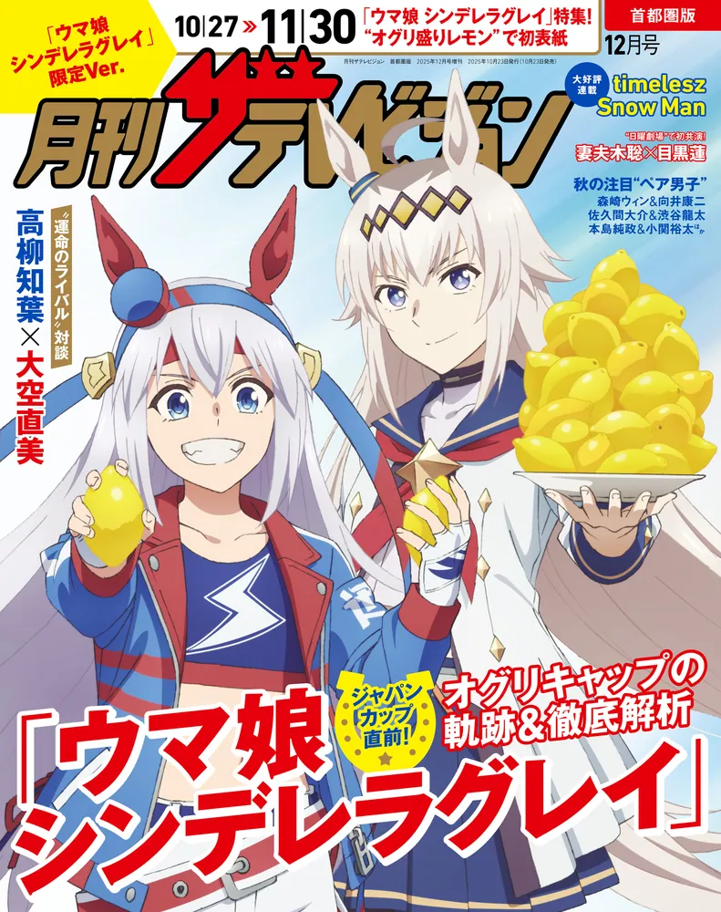 放送中のアニメ「ウマ娘 シンデレラグレイ」とコラボ。主人公のオグリキャップ、ライバルのタマモクロスがレモンを持って表紙に!